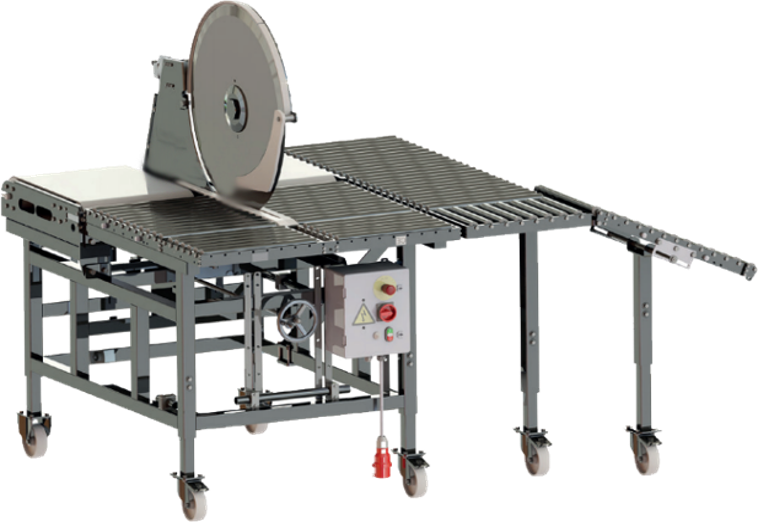 Disc knife table version fixed to a table with integrated rollers for pork primal cutting.
