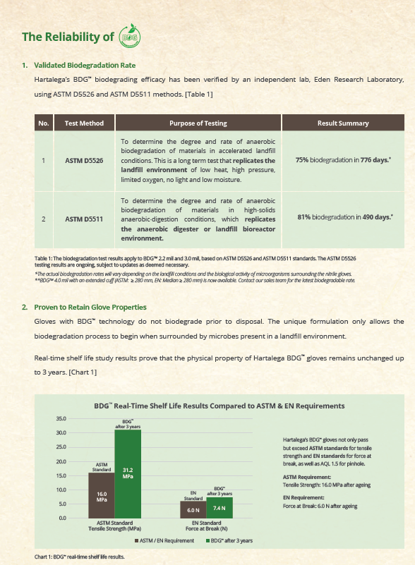 ASTM D6319, ASTM D5511, ASTM D5151, ASTM F1671, ASTM D6978, AS/NZS 4011.1, CEN/TS 14234, EN 16523-1, EN ISO 374 part 1 (Type C), 2, 4 & 5, EN 1186, EN ISO 21420, EN 455 part 1, 2, 3 & 4,EN 13130, ISO 10993 part 5, 10, 11 & 23, HACCP International Certified