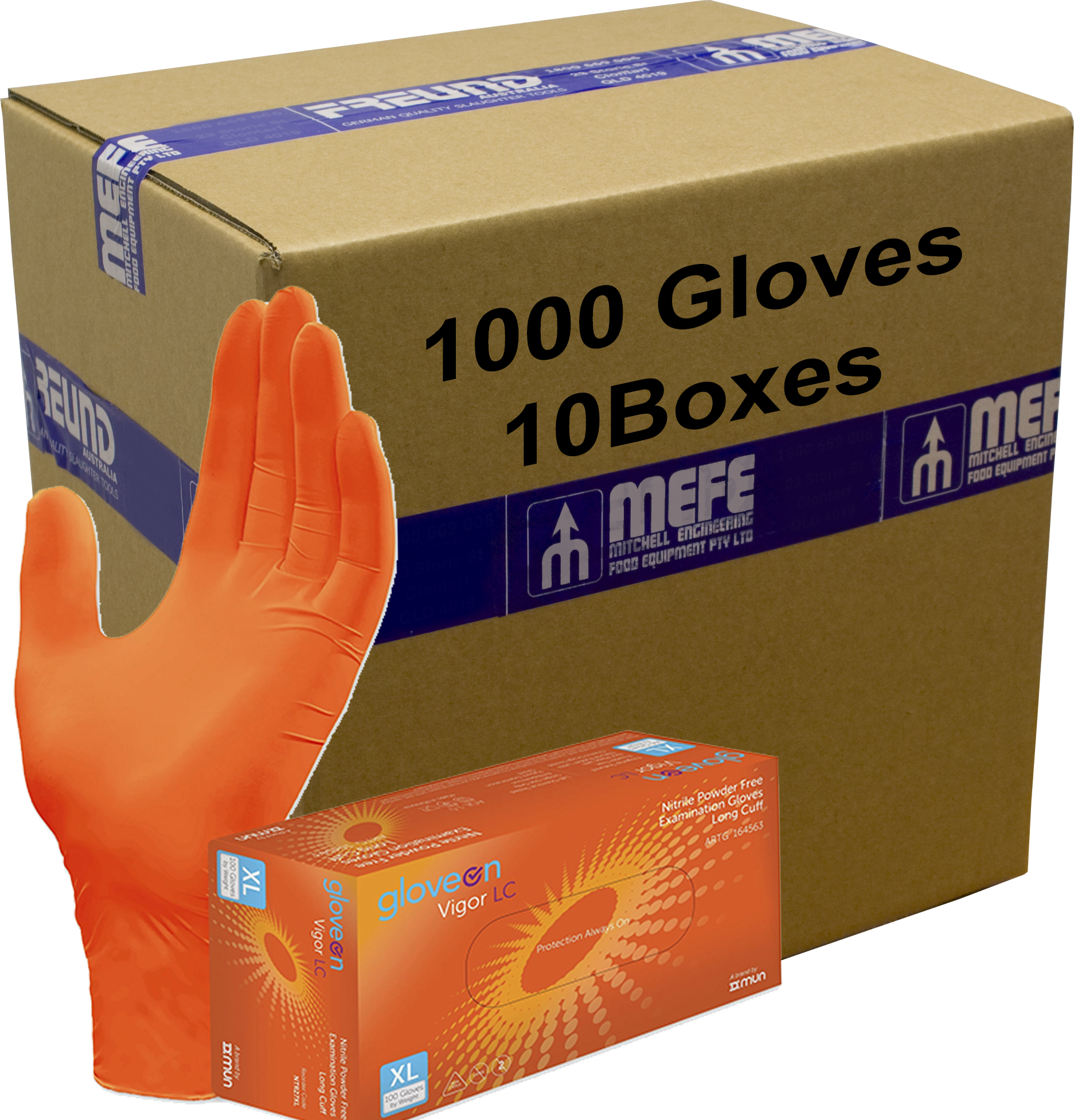 GloveON Vigor LC Heavy Duty Nitrile Gloves deliver superior protection and comfort for demanding food handling and industrial tasks. Their extended long cuff and vibrant orange colour enhance visibility and wrist protection, while the powder-free, latex-free design ensures safety and compliance with Australian food standards. Ideal for butchers, abattoirs, seafood processors, and commercial kitchens requiring durable, food-safe gloves that perform under pressure.