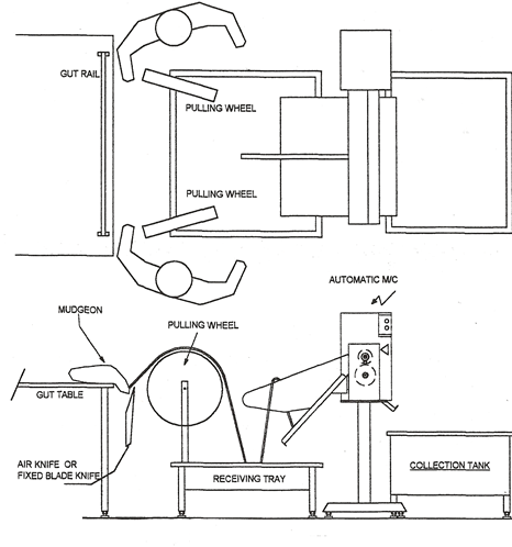Operator feeds the intestine onto the loading bar which pulls it into the cleaner