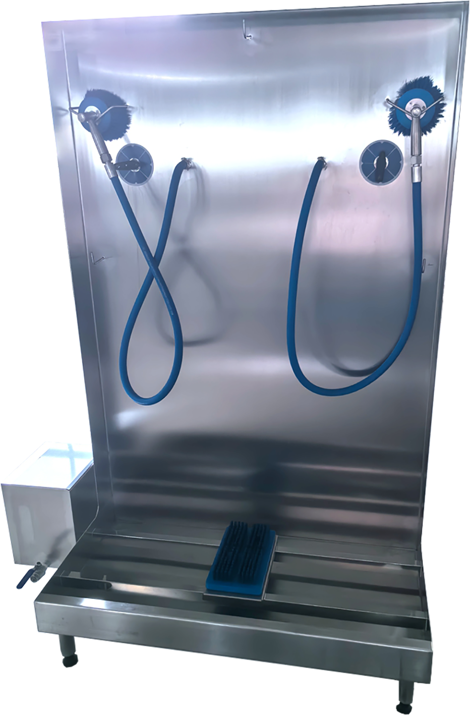 Built from GR304 stainless steel and supplied with hoses, brushes and an auto siphon liquid dispenser, this unit is designed for professional environments where durability and straightforward operation matter. The integrated brush and tank connections help create an efficient apron and shoe cleaning station within washdown zones.